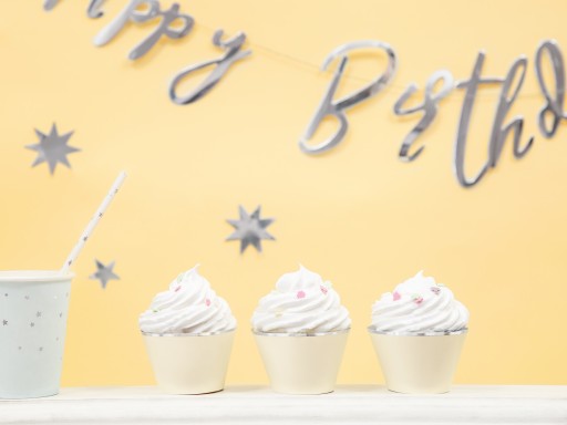 Papilotki na muffinki Elegant Bliss w kolorze jasnokremowym ze srebrnymi metalizowanymi brzegami, wymiary po złożeniu ok. 4,8 x 7,6 x 4,6 cm.