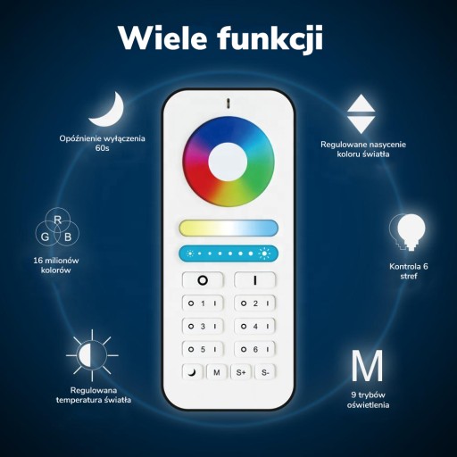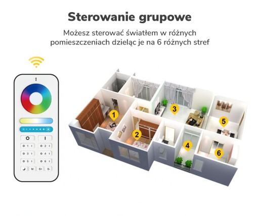 To produkt wysokiej jakości, który umożliwia sterowanie oświetleniem aż w 6 strefach. Pilot umożliwia sterowanie kontrolerami LED wielokolorowymi RGB+CCT Taśmy 6 pinowe/żyłowe kolory+ biały z kontrolą temperatury białego.