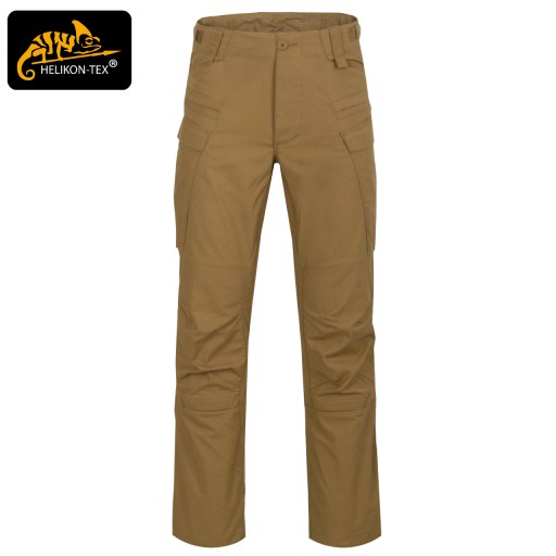 Profilowane wzmocnienia na kolanach zapobiegają wypychaniu się materiału oraz mogą posłużyć do przenoszenia wewnętrznych wkładek ochronnych. Spodnie zapinane są na guziki z logo Helikon-Tex®, natomiast w talii regulowane są za pomocą taśm z rzepami.