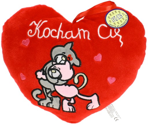 Świetna poduszka w kształcie serca z haftowanym napisem i serduszkami.