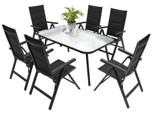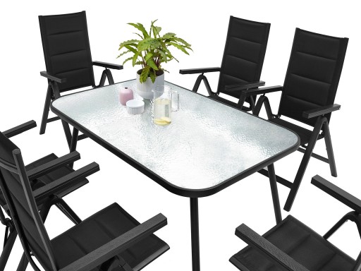 ZESTAW MEBLI OGRODOWYCH idealny do Twojego ogrodu. Stelaż został podwójnie lakierowany proszkowo, co idealnie przystosowuje ten produkt do zastosowania wewnątrz jak i na zewnątrz. Siedzisko krzesła oraz oparcie zostało zrobione z czarnego, elastycznego obicia tekstylnego z wypełnieniem miękką pianką tak, aby maksymalnie zwiększyć wygodę. Posiada ono dwa oparcia boczne wykonane z deski kompozytowej wpc. Użyte materiały nie wymagają częstej konserwacji, są odporne na warunki pogodowe i nie wymagają specjalnych środków do pielęgnacji. Nóżki są dodatkowo zaopatrzone w nakładki z tworzywa sztucznego. Stół posiada blat z przezroczystej hartowanej szyby o gr. 5 mm.