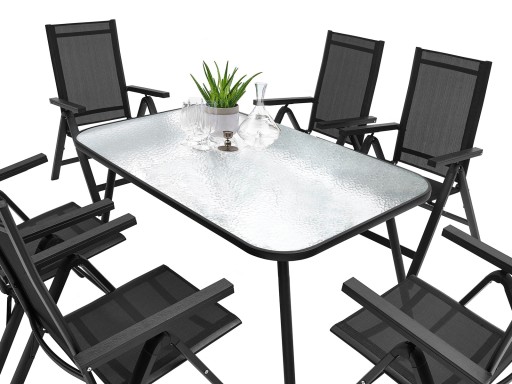 ZESTAW MEBLI OGRODOWYCH idealny do Twojego ogrodu. Stelaż został podwójnie lakierowany proszkowo, co idealnie przystosowuje ten produkt do zastosowania wewnątrz jak i na zewnątrz. Siedzisko krzesła oraz oparcie zostało zrobione z czarnego, elastycznego obicia tekstylnego tak, aby maksymalnie zwiększyć wygodę. Posiada ono dwa oparcia boczne wykonane z deski kompozytowej wpc. Użyte materiały nie wymagają częstej konserwacji, są odporne na warunki pogodowe i nie wymagają specjalnych środków do pielęgnacji. Nóżki są dodatkowo zaopatrzone w nakładki z tworzywa sztucznego. Stół posiada blat z przezroczystej hartowanej szyby o gr. 5 mm.
