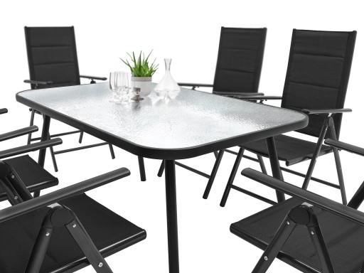 ZESTAW MEBLI OGRODOWYCH idealny do Twojego ogrodu. Stelaż został podwójnie lakierowany proszkowo, co idealnie przystosowuje ten produkt to zastosowania wewnątrz jak i na zewnątrz. Siedzisko krzesła oraz oparcie zostało zrobione z czarnego, elastycznego obicia tekstylnego z wypełnieniem miękką pianką tak, aby maksymalnie zwiększyć wygodę. Posiada ono dwa oparcia boczne. Użyte materiały nie wymagają częstej konserwacji, są odporne na warunki pogodowe i nie wymagają specjalnych środków do pielęgnacji. Nóżki są dodatkowo zaopatrzone w nakładki z tworzywa sztucznego. Stół posiada blat z przezroczystej hartowanej szyby o gr. 5 mm.