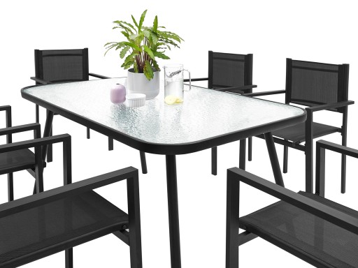 ZESTAW MEBLI OGRODOWYCH idealny do Twojego ogrodu. Stelaż został podwójnie lakierowany proszkowo, co idealnie przystosowuje ten produkt do zastosowania wewnątrz jak i na zewnątrz. Siedzisko krzesła oraz oparcie zostało zrobione z czarnego, elastycznego obicia tekstylnego tak, aby maksymalnie zwiększyć wygodę. Posiada ono dwa oparcia boczne. Użyte materiały nie wymagają częstej konserwacji, są odporne na warunki pogodowe i nie wymagają specjalnych środków do pielęgnacji. Nóżki są dodatkowo zaopatrzone w nakładki z tworzywa sztucznego. Stół posiada blat z przezroczystej hartowanej szyby o gr. 5 mm.