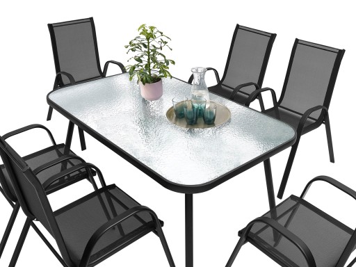 ZESTAW MEBLI OGRODOWYCH idealny do Twojego ogrodu. Stelaż został podwójnie lakierowany proszkowo, co idealnie przystosowuje ten produkt do zastosowania wewnątrz jak i na zewnątrz. Siedzisko krzesła oraz oparcie zostało zrobione z czarnego, elastycznego obicia tekstylnego tak, aby maksymalnie zwiększyć wygodę. Posiada ono dwa oparcia boczne. Użyte materiały nie wymagają częstej konserwacji, są odporne na warunki pogodowe i nie wymagają specjalnych środków do pielęgnacji. Nóżki są dodatkowo zaopatrzone w nakładki z tworzywa sztucznego. Stół posiada blat z przezroczystej hartowanej szyby o gr. 5 mm.