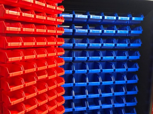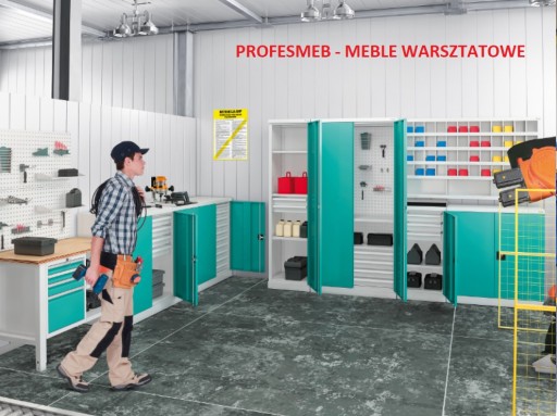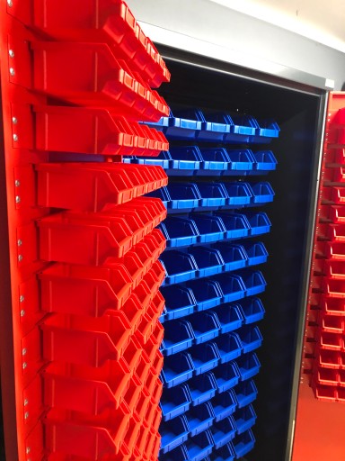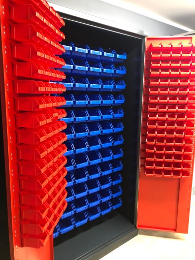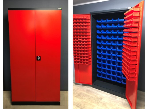 Wszystkie elementy szafy wykonane z blachy stalowej gr.1,0 mm. Drzwi ze schowanymi zawiasami. Uchwyt drzwiowy z zamkiem zabezpieczającym z ryglowaniem w dwóch punktach. Szafa wyposażona w listwy do mocowania pojemników narzędziowych o wymiarach 108 x 144 x 224 /170 mm (72 sztuki) na ścianie tylnej i o wymiarach 56 x 77 x 119 /90 mm (po 80 sztuk) na drzwiach szafy. Szafa dostarczana z pojemnikami.