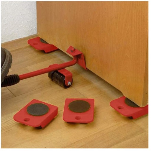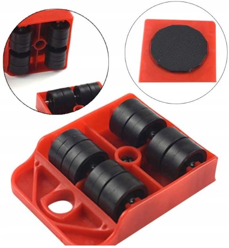 ✅ Plastikowe podstawki z rolkami przeznaczone do transportu i ustawiania mebli lub innych ładunków o ciężarze do 150 kg. Stalowa dźwignia służy do uniesienia ładunku przed wsunięciem podstawek z rolkami .