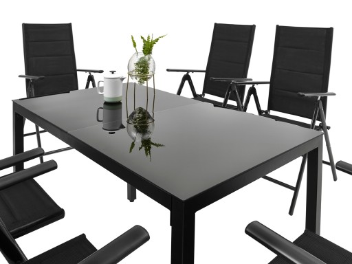 ZESTAW MEBLI OGRODOWYCH idealny do Twojego ogrodu. Stelaż został podwójnie lakierowany proszkowo, co idealnie przystosowuje ten produkt do zastosowania wewnątrz jak i na zewnątrz. Siedzisko krzesła oraz oparcie zostało zrobione z czarnego, elastycznego obicia tekstylnego z wypełnieniem miękką pianką tak, aby maksymalnie zwiększyć wygodę. Posiada ono dwa oparcia boczne. Użyte materiały nie wymagają częstej konserwacji, są odporne na warunki pogodowe i nie wymagają specjalnych środków do pielęgnacji. Nóżki są dodatkowo zaopatrzone w nakładki z tworzywa sztucznego. Stół posiada blat z czarnej hartowanej szyby o gr. 5 mm.