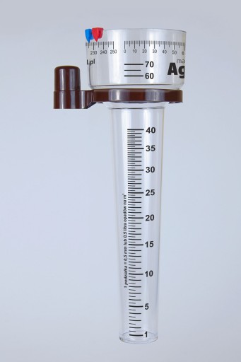 Po odczycie opadu (na pionowej skali) należy przesunąć kolorowy wskaźnik na poziomej skali o tyle kresek ile wskazał odczyt. Po zaznaczeniu należy wylać wodę.