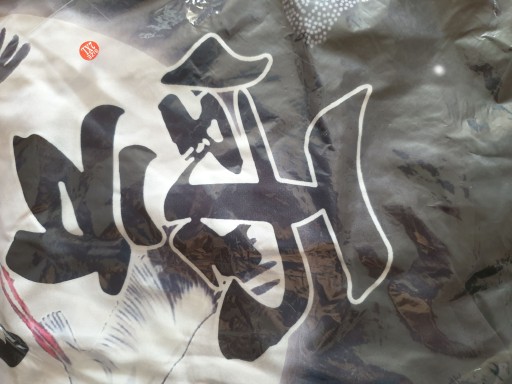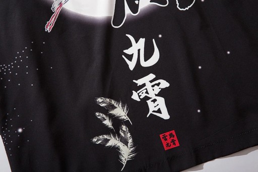 Dwa duże, czarne kanji z tyłu i dwa mniejsze z przodu (雲; kumo oraz 鶴; tsuru) oznaczają "chmurę" oraz "żurawia" (język japoński). Te same znaczenie mają w języku chińskim (雲; yún oraz 鶴; hè). Dwa mniejsze, białe z tyłu (九; kyū oraz 霄; shō) oznaczają dosłownie "dziewięć mgieł". Dużo ciekawsze jest znaczenie tych znaków w języku chińskim (九; jiǔ) oraz (霄; xiāo) - nie czytamy ich jako "dziewiąte niebo" – istnieje bowiem ukryte znaczenie. Drugi znak (霄) zapisujemy również jako 天 (Tiān; jedno z najstarszych słów; kluczowe pojęcie chińskiej mitologii, filozofii i religii). 九天 (jiǔtiān) oznacza "najwyższe z nieb".