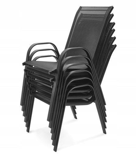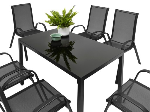 ZESTAW MEBLI OGRODOWYCH idealny do Twojego ogrodu. Stelaż został podwójnie lakierowany proszkowo, co idealnie przystosowuje ten produkt to zastosowania wewnątrz jak i na zewnątrz. Siedzisko krzesła oraz oparcie zostało zrobione z czarnego, elastycznego obicia tekstylnego tak, aby maksymalnie zwiększyć wygodę. Posiada ono dwa oparcia boczne. Użyte materiały nie wymagają częstej konserwacji, są odporne na warunki pogodowe i nie wymagają specjalnych środków do pielęgnacji. Nóżki są dodatkowo zaopatrzone w nakładki z tworzywa sztucznego.Stół posiada blat z czarnej hartowanej szyby o gr. 5 mm.