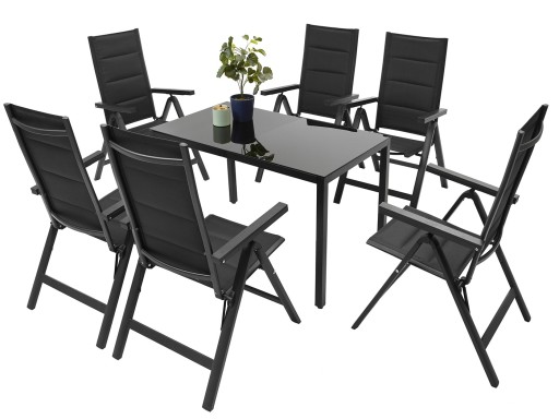 ZESTAW MEBLI OGRODOWYCH idealny do Twojego ogrodu. Stelaż został podwójnie lakierowany proszkowo, co idealnie przystosowuje ten produkt do zastosowania wewnątrz jak i na zewnątrz. Siedzisko krzesła oraz oparcie zostało zrobione z czarnego, elastycznego obicia tekstylnego z wypełnieniem miękką pianką tak, aby maksymalnie zwiększyć wygodę. Posiada ono dwa oparcia boczne wykonane z deski kompozytowej wpc. Użyte materiały nie wymagają częstej konserwacji, są odporne na warunki pogodowe i nie wymagają specjalnych środków do pielęgnacji. Nóżki są dodatkowo zaopatrzone w nakładki z tworzywa sztucznego. Stół posiada blat z czarnej hartowanej szyby o gr. 5 mm.