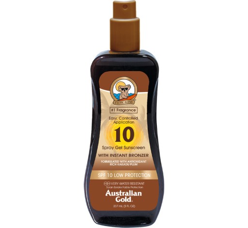 Australian Gold SPF 10 w bardzo rozpoznawalnej brązowej butelce to żel w sprayu zawierający bronzer. Doskonale chroni przed promieniowaniem UVA i UVB i szybko się wchłania. Dzięki naturalnym karmelowym bronzerom zapewnia szybką opaleniznę, której odcień będzie niewiarygodnie ciemny. W skład żelu wchodzi m.in. aloes, witamina E, olej z australijskiego drzewa herbacianego, Śliwka Kakadu (najbogatsze źródło witaminy C) i ekstrakty z nasion słonecznika, aby nie tylko dobrze chronić skórę, ale oprócz tego także znakomicie ją pielęgnować. Dodatkowo cudownie pachnie! Zapach nawiązuje do błogiego urlopu i słonecznych wakacji! Butelka typu spray 237 ml.