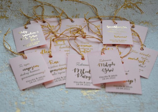 W cenie 30 zł otrzymają Państwo 1 komplet czyli 48 Sztuk zawieszek spersonalizowanych na alkohol z różnymi tekstami mix spośród 16 wzorów tekstów + złote sznureczki