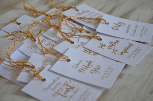 Oferujemy Państwu ręcznie robione zawieszki na alkohol wykonane z wysokiej jakości papieru białego napisy złocone. Zawieszki zdobione złotym sznurkiem.