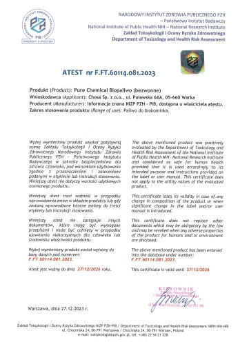 Nasze biopaliwo Pure Chemical™ posiada aktualny atest PZH nr F.FT.60114.081.2023, co gwarantuje, że jest ono bezpieczne dla zdrowia i zgodne z najwyższymi standardami jakości.