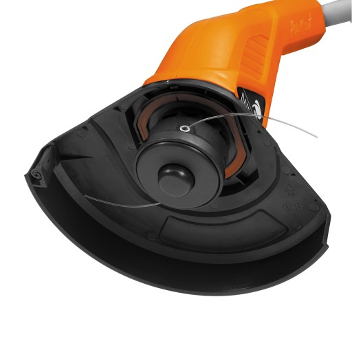 Wykonana z wytrzymałego tworzywa ABS osłona niezawodnie chroni użytkownika przed wyrzucanymi przez głowicę kamieniami i drobinkami, a także osłania rośliny poza obszarem pracy, umożliwiając precyzyjne podkaszanie pod krzewami, wokół drzewek i rabat kwiatowych.
