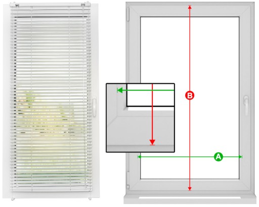 Wysokość żaluzji B to- wysokość całkowita skrzydła okna minus 2 cm