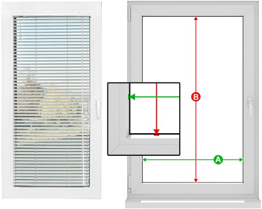 Wysokość żaluzji B to- wysokość szyby wraz z uszczelką