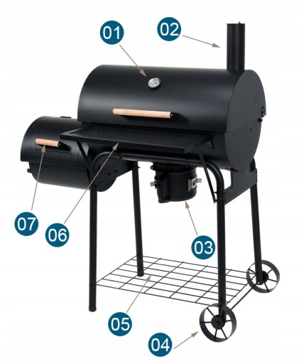 - metalowe półki: frontowa oraz dolna na talerze lub przybory grillowe itp.