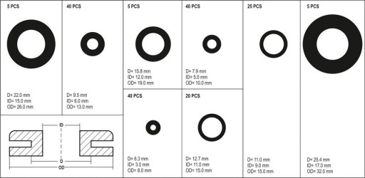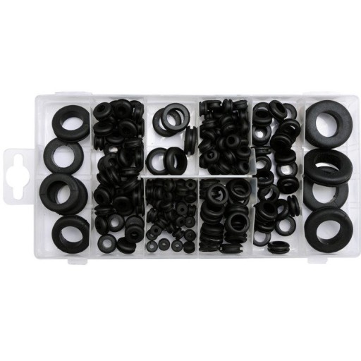 Zestaw przelotek gumowych zawiera 180 sztuk w rożnym rozmiarze. Całość umieszczono w wygodnym opakowaniu typu "sortownik".