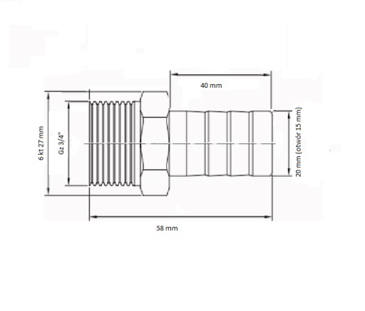 Nypel, gruba złączka GZ 3/4" na wąż 19mm, sześciokąt na klucz