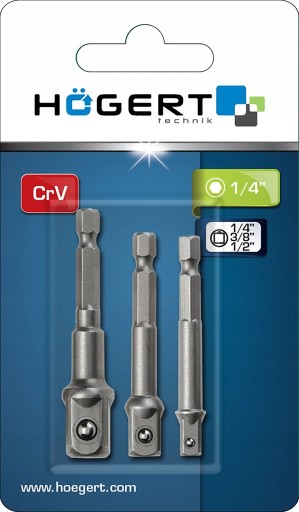 Komplet trzech uchwytów wiertarkowych do nasadek wykonany ze stali stopowej chromowo-wanadowej (CrV) dzięki czemu są odporne na zarysowania (odkuwane matrycowo). Nasadki 1/4", 3/8”, 1/2" mogą być stosowane w wiertarko-wkrętarkach sieciowych i akumulatorowych.