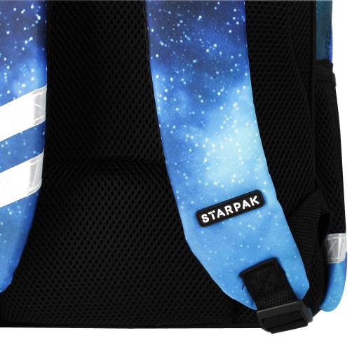 Główna komora plecaka STARPAK została wyłożona specjalną wzmocniona i łatwą w czyszczeniu podszewką. Komora jest bardzo pojemna. Zmieści się w niej wszystko co potrzebne w szkole. Dodatkowo 2 przednie kieszenie ułatwią utrzymanie porządku i poprawią organizację. Z obu stron plecaka umieściliśmy siatkowe kieszenie na butelki z napojem. Kieszenie zostały specjalnie wzmocnione wytrzymałem materiałem.