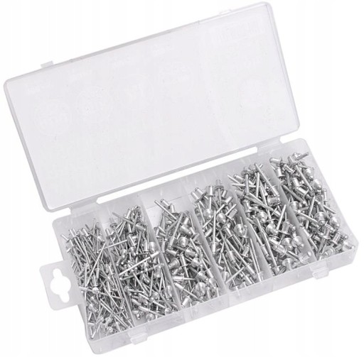 Zestaw 400 sztuk aluminiowych nitów zrywalnych z trzpieniem stalowym. Zestaw zawiera cztery najbardziej popularne rozmiary od 2.4 mm do 4.8 mm