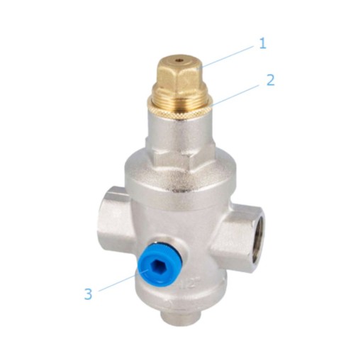Reduktory ciśnienia BPR posiadają przyłącza pod manometr (3) po obu stronach korpusu, dzięki czemu mogą być stosowane w różnych położeniach w instalacji. Za pomocą śruby nastawy (1) dokonuje się regulacji ciśnienia wyjściowego. Kręcąc zgodnie z ruchem wskazówek zegara podnosimy ciśnienie za reduktorem. Przeciwnie do ruchu wskazówek zegara obniżamy ciśnienie za reduktorem. Fabrycznie, każdy z reduktorów ustawiony jest na wartość ciśnienia wyjściowego 3 bar. Za pomocą mosiężnego pierścienia (2) ograniczającego blokujemy nastawę. Na korpusie reduktorów znajduje się strzałka wskazująca kierunek przepływu medium.