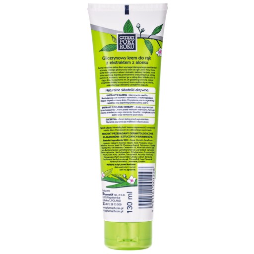Glicerynowy krem do rąk z ekstraktem z aloesu. Sucha i wrażliwa skóra dłoni wymaga intensywnego nawilżenia i ochrony. Dlatego glicerynowy krem do rąk Cztery Pory Roku został wzbogacony o aloes i ekstrakt z zielonej herbaty, które silnie nawilżają, łagodzą podrażnienia oraz pielęgnują płytkę paznokcia. Wystarczy wetrzeć go w skórę dłoni kilkakrotnie w ciągu dnia, by zapewnić im 24-godzinną ochronę. Dzięki wyjątkowo lekkiej konsystencji krem szybko się wchłania, pozostawiając delikatny i przyjemny zapach.