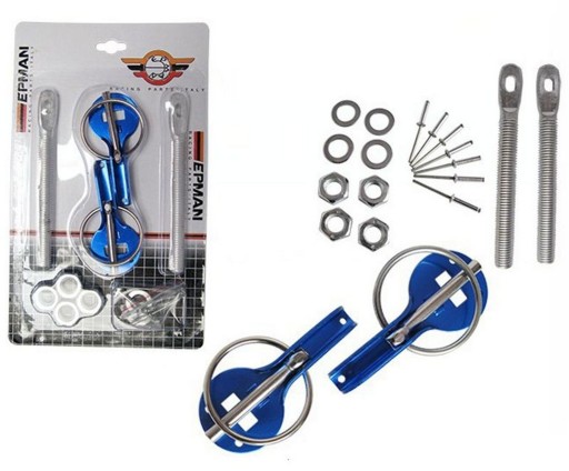 Rajdowe zapinki maski samochodu firmy EPMAN. Wykonane z aluminium. Idealnie nadają się do KJS, Rajdów, Wyścigów, Drifu czy stylizacji samochodu. W komplecie jest wszystko co potrzebne do montażu, zdjęcia się w żaden sposób podrasowane przedstawiają dokładnie sprzedawany towar.