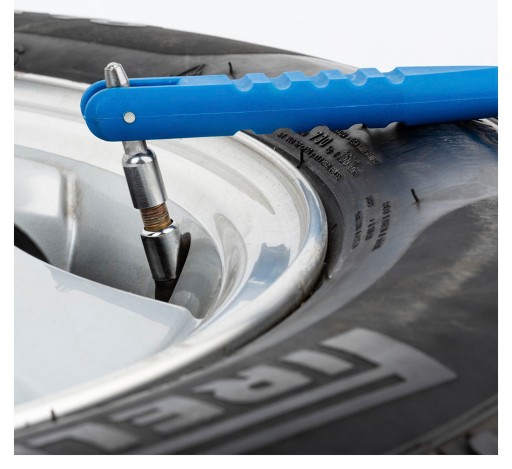 Przyrząd wykonany z mocnego kompozytu, w pełni zapobiega powstawaniu zarysowań na krawędzi felgi aluminiowej. Blokada kulowa unieruchamia końcówkę podczas nakręcania na zawór. Nacięcia u podstawy nie pozwalają ześlizgnąć się dźwigni z felgi.