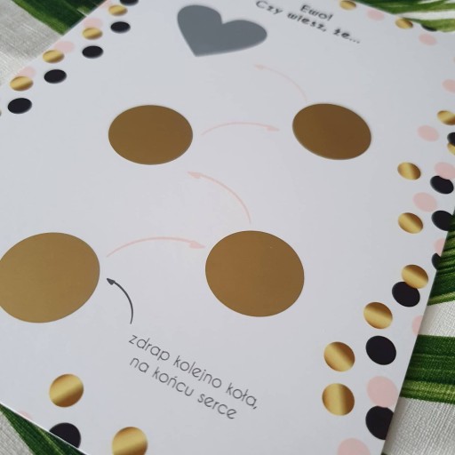 Cena podana dla jednej kartki. Format ok 15x20 cm, druk jednostronny. Zdrapka w kształcie kółek i serduszka.