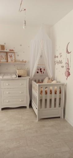- Od dołu głęboka (12 cm ) szuflada na prowadnicach rolowych, idealna na wiele rzeczy maluszka, wykończona frontem z ozdobnym filunkiem pojawiającym się również na boku łóżeczka