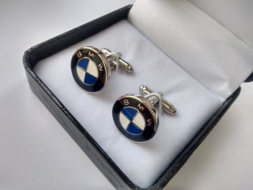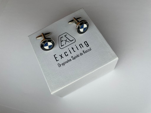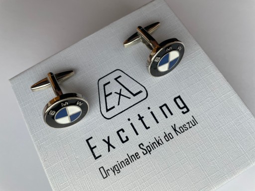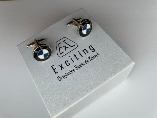 Spinki do mankietów koszuli EXC dla fana BMW chromowane, z malowanym logo marki zapakowane w białe pudełko, Etui do wręczania jako prezent oraz do bezpiecznego przechowywania spinek.