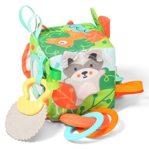 Interesująca kostka sensoryczna FRIENDLY FOREST pobudza spostrzegawczość małego dziecka dzięki zróżnicowanym wielobarwnym obrazkom o tematyce leśnej. Zachęca je również do działania - wspomaga odruch chwytu dzięki licznym wystającym przestrzennym elementom o różnej strukturze materiałów jak kolorowe tasiemki, plastikowe kółka z tłoczeniami, specjalny materiałowy uchwyt czy przeźroczyste kółeczko-grzechotka. Rozwija także słuch dziecka poprzez dodanie piszczka i grzechotka. Pogłębia percepcję dziecka dzięki zwiększeniu możliwości czuciowych za sprawą silikonowego gryzaka przynoszącego ulgę w masowaniu dziąseł zwłaszcza w okresie ząbkowania.