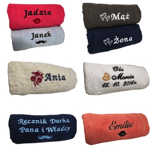 Wykonujemy ręczniki z imionami, indywidualnymi tekstami, ponadto wykonujemy ręczniki ślubne z datami zaślubin i imionami nowożeńców, oraz metryczki dziecka.