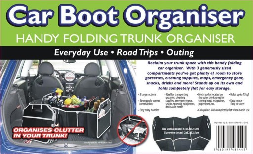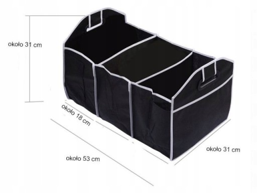 Torba, organizer, postawiony w bagażniku samochodu zmieści przydatne rzeczy, które często wozimy w aucie.Po złożeniu nie zajmuje wiele miejsca. Ma praktyczny, czarny kolor i wygodne, mocne uchwyty. Organizer zawsze możesz mieć pod ręką i rozkładać tylko w czasie potrzeby.