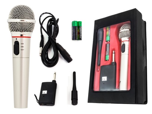 Mikrofon może być używany jako bezprzewodowy lub przewodowy. Do sprzętu stereo wystarczy podłączyć odbiornik FM lub bezpośrednio przewód do mikrofonu. Mikrofon działa w profesjonalnym standardzie Jack i posiada odłączaną antenę. Idealny do karaoke, występów, imprez, na wesela. Mikrofon ma funkcję wyciszania - przycisk MIC. Zestaw zapakowany w etui.