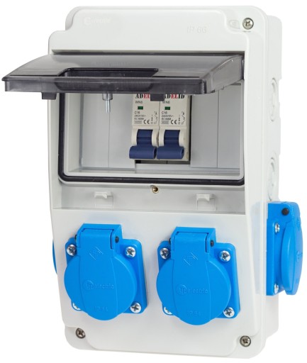 Gniazda 230V posiadają klapki, zapewniające szczelność na poziomie IP54, co wpływa bezpośrednio na BEZPIECZEŃSTWO użytkowania rozdzielnicy.