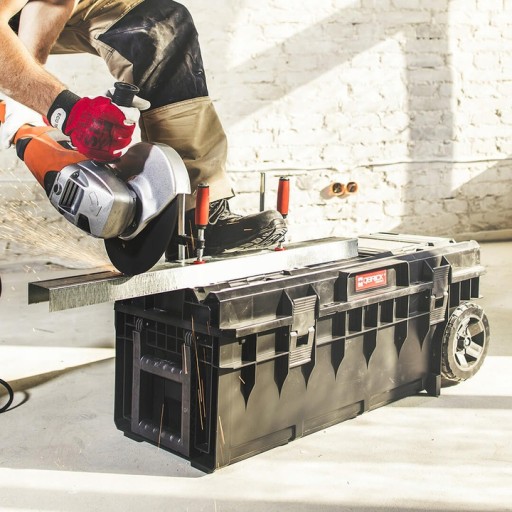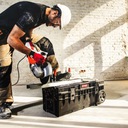 Mobile tool box allows you to transport long power tools such as: Impact hammers, angle grinders or cement mixers with the necessary accessories. Its above-standard dimensions make it a unique product in its category.