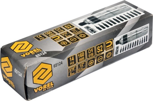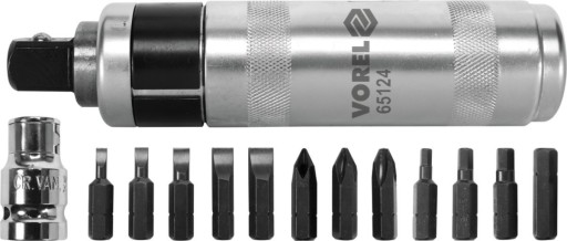 Wkrętak udarowy o długości 160mm z 12 czernionymi końcówkami marki VOREL 65124. Bity oaz wkrętak wykonane z wytrzymałej, narzędziowej stali chromowo-wanadowej CrV.