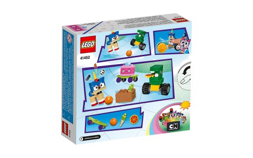 Przeżyj ponownie ulubione sceny z najbardziej radosnego, błyszczącego i kolorowego serialu telewizyjnego na antenie w zestawie LEGO® Unikitty™! 41452 Rowerek Księcia Piesia Rożka™. Ten ciekawy pojazd ma dwa miotacze do strzelania klockami błyszczącej materii, kość, flagę, ogromną, toczącą się piłkę do koszykówki zamiast przedniego koła oraz tylne koła z nadrukiem piłek baseballowych. W zestawie jest też skrzynia smakołyków i trzy postacie z serialu do zbudowania.