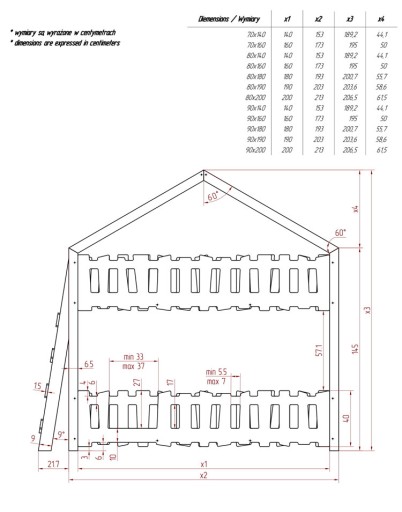 - Wymiary pod materac: 90x140, Wymiary całkowite: wysokość - 189cm, długość - 153cm, szerokość - 96cm,