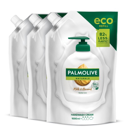 Zestaw zawiera trzy opakowania uzupełniające mydła w płynie PALMOLIVE NATURALS Milk & Almond, każde o pojemności aż 1000 ml.