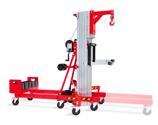 Ten podnośnik do materiałów, z 5 aluminiowymi profilami masztu podnoszonymi za pomocą systemu kół pasowych, jest dostarczany ze wszystkimi niezbędnymi komponentami i akcesoriami do jego użytkowania: bocznymi nogami stabilizującymi z niwelatorami, widłami, wciągarką z podwójnym uchwytem, kołami do manewrowania w pionie i poziomie itp.