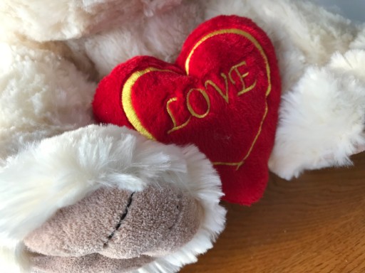 PIES KREMOWY Z CZERWONYM PLUSZOWYM SERDUSZKIEM Z NAPISEM LOVE
