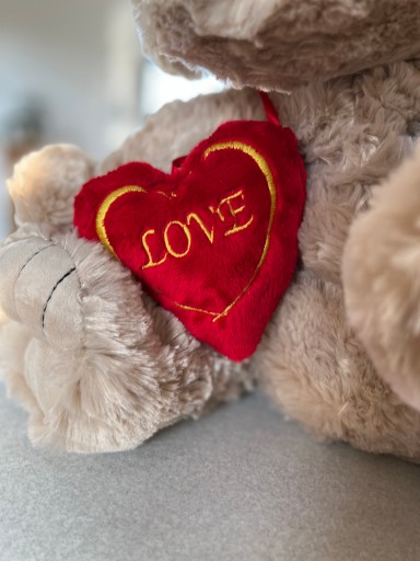 PIES BEŻOWY Z CZERWONYM PLUSZOWYM SERDUSZKIEM Z NAPISEM LOVE