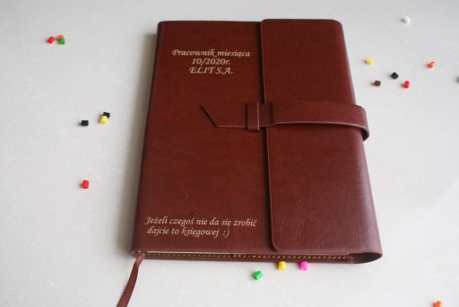 Elegancki notes formatu A5 w klasycznej okładce wykonanej z ekoskóry. Notes zawiera 80 kartek w linie oraz praktyczną wstążeczkę - zakładkę. Wewnątrz okładki miejsce na 3 wizytówki, długopis (jest w komplecie) oraz pamięć USB (brak w komplecie). Okładka nie jest umocowana na stałe do bloku notesu, tylko nasuwana na pierwsze kartki, co daje możliwość wymiany notesu. Notes zamykany za pomocą paska z ekoskóry. Na okładce wykonujemy grawer według Twoich informacji. (przed wykonaniem możemy zrobić projekt)